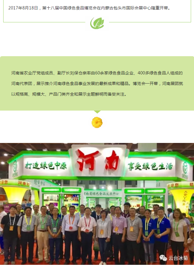 云臺冰菊不僅凸顯了河南綠色食品大家族、新發(fā)展和新形象,也為本屆博覽會“綠色理念、綠色生產(chǎn)、綠色消費(fèi)”主題貢獻(xiàn)了一己之力,受到蒞會領(lǐng)導(dǎo)、廣大市民、國內(nèi)外客商和各類媒體的廣泛關(guān)注和高度稱贊。